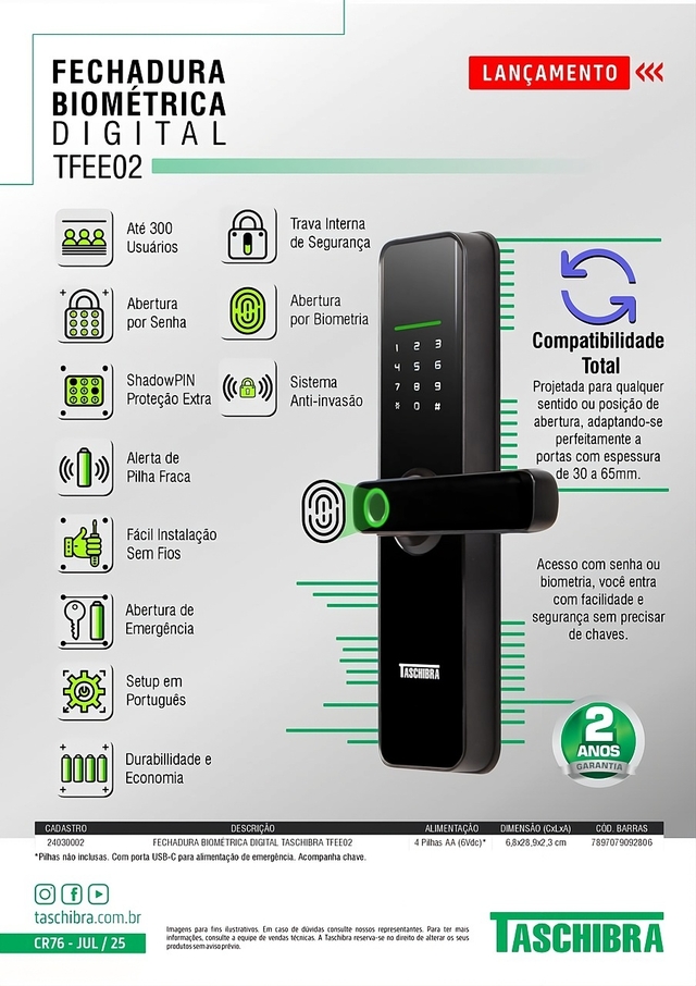 A Fechadura Digital TFEE02 Taschibra oferece o máximo em conforto e proteção para residências, escritórios e ambientes corporativos. Com design moderno e funcional, adapta-se a qualquer sentido de abertura de porta e é compatível com espessuras entre 30 e 65 mm.