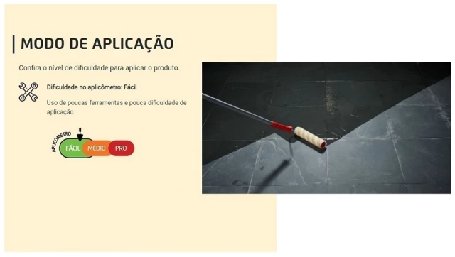 Aplicação: utilizar rolo, pincel ou trincha; aplicar em demãos finas cruzadas.