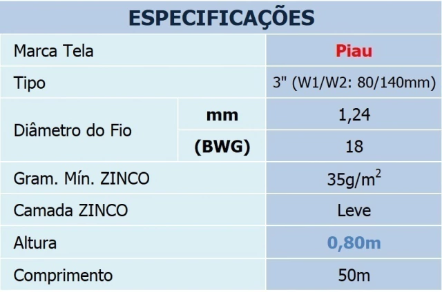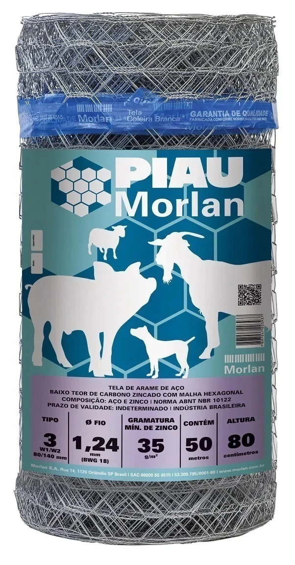 A Tela Mangueirão Morlan Piau 0,80 x 50 m, produzida em aço galvanizado, possui malha 3" e fio 1,80 mm, garantindo resistência, durabilidade e instalação prática.