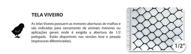 Linha/Aplicação: Viveiro (proteção de aves pequenas, pinteiros e cercamentos leves)